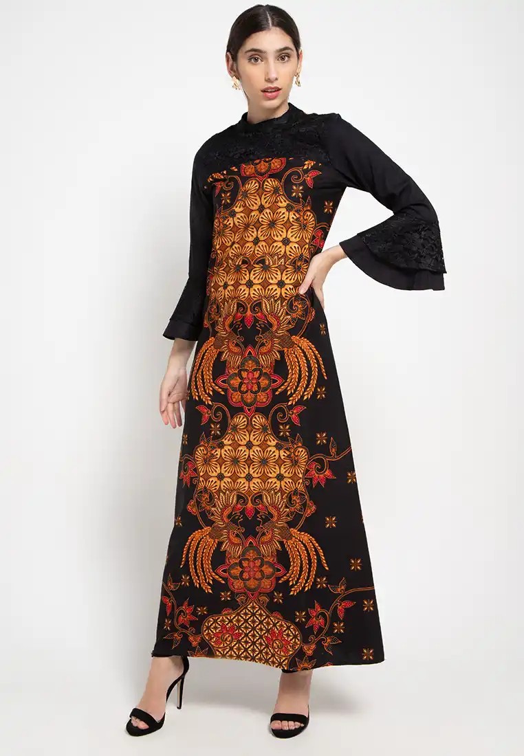• Gamis, long dress for a formal look, detailed with classic batik print motifs with brocade sleeve accents