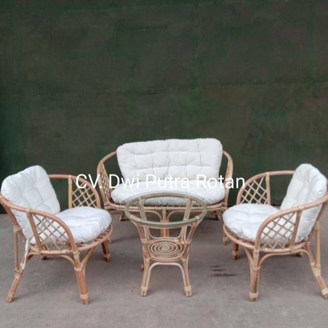 Rattan Frame and rattan decoration with cushion fabric and glass on top table.