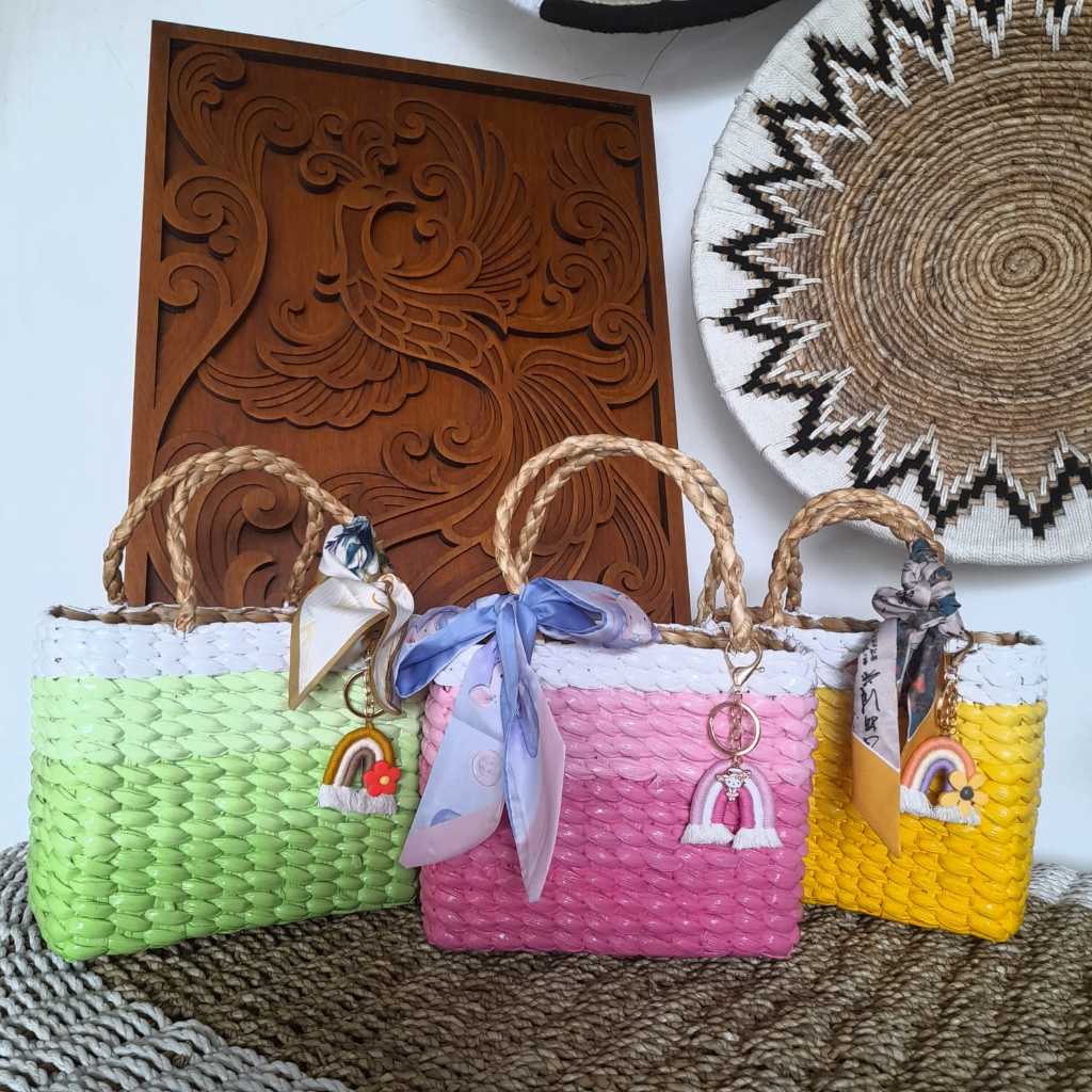 This stylish handbag is crafted from woven water hyacinth, showcasing vibrant, natural colors that exude ...
