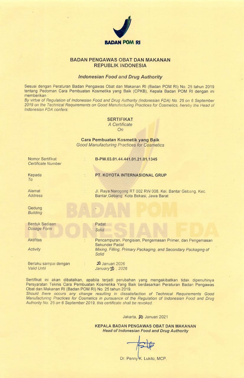 Koyota International Group is a bar soap manufacturing company from Indonesia located in Bekasi City, Jakarta. We are determined to fulfill our commitment to manufacture each piece of soap’s as perfect as a pearl at the price of a single lemon.