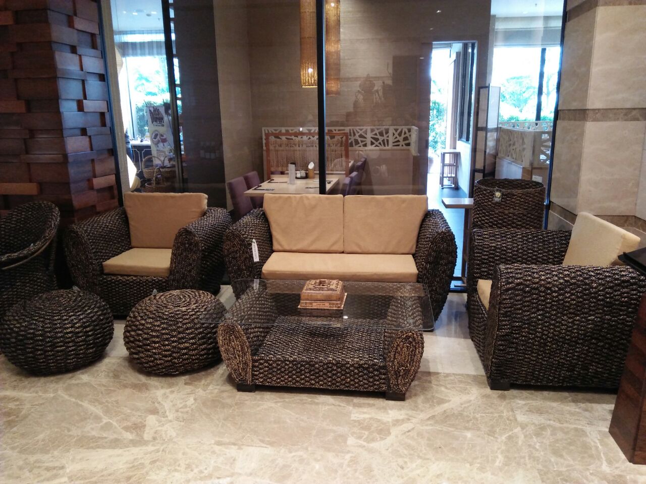 TABLE SET  (1 LONG SOFA, 2 BIG CHAIRS & 1 TABLE WITH GLASS ON IT) FOAM & PILLOW GRADE A. BEAUTIFY YOUR LIVING ROOM OR TERRACE WITH NATURAL & ECOFRIENDLY MATERIALS. DIMENSION :