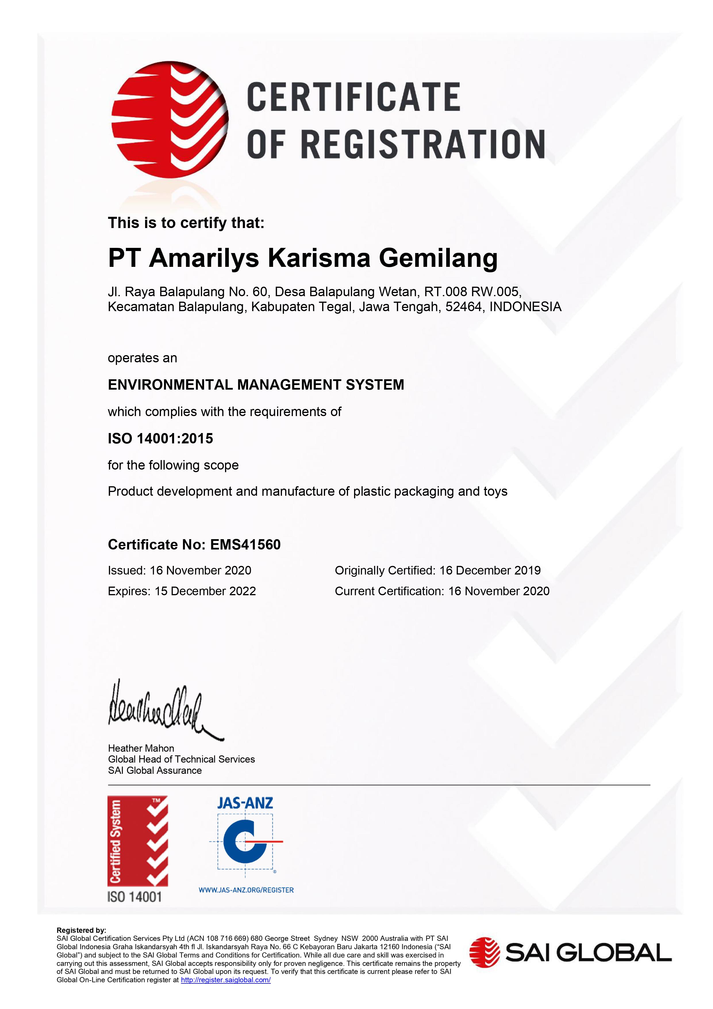 Type of Certificate Environmental Management System