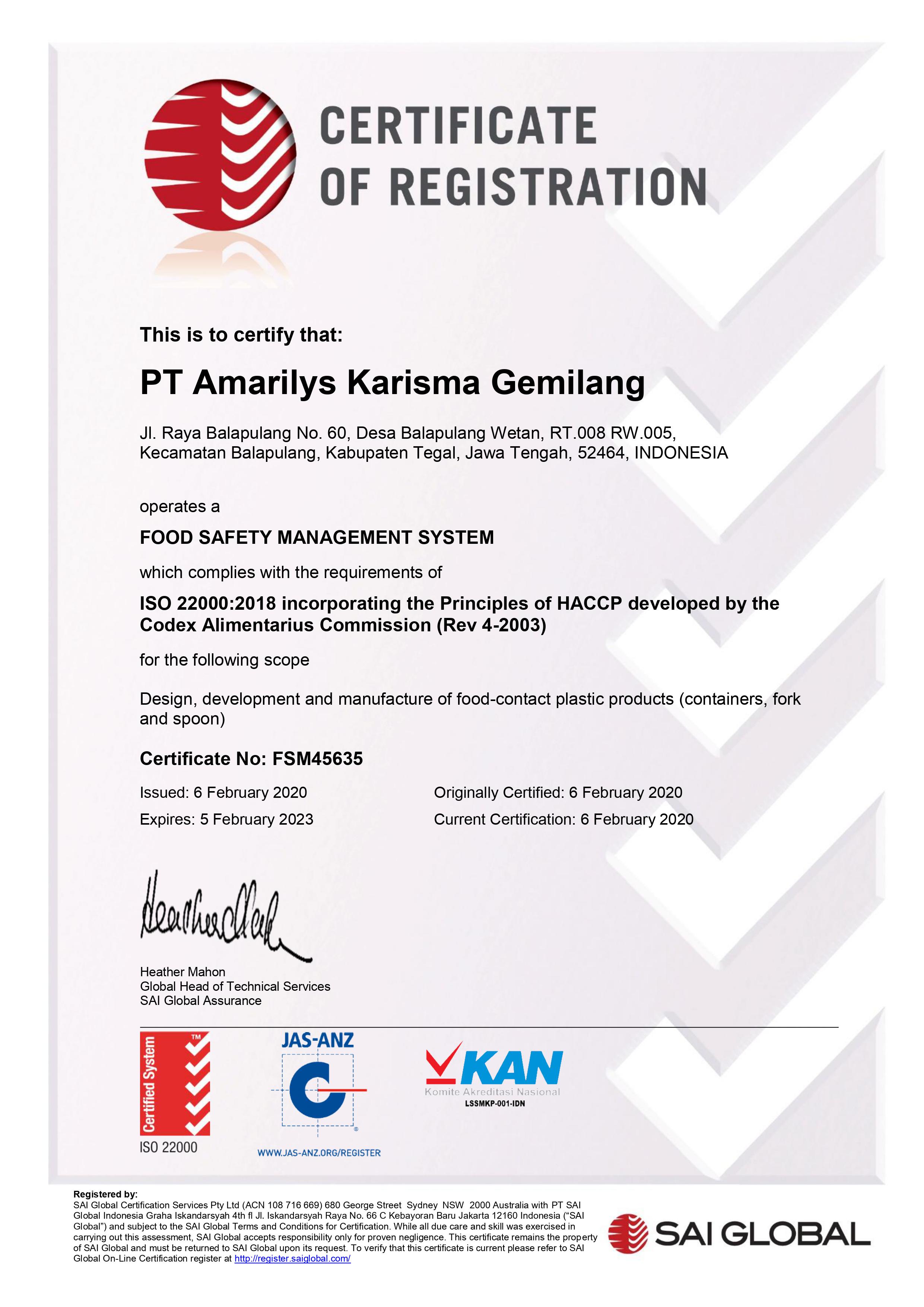 Type of Certificate Food Safety Management System