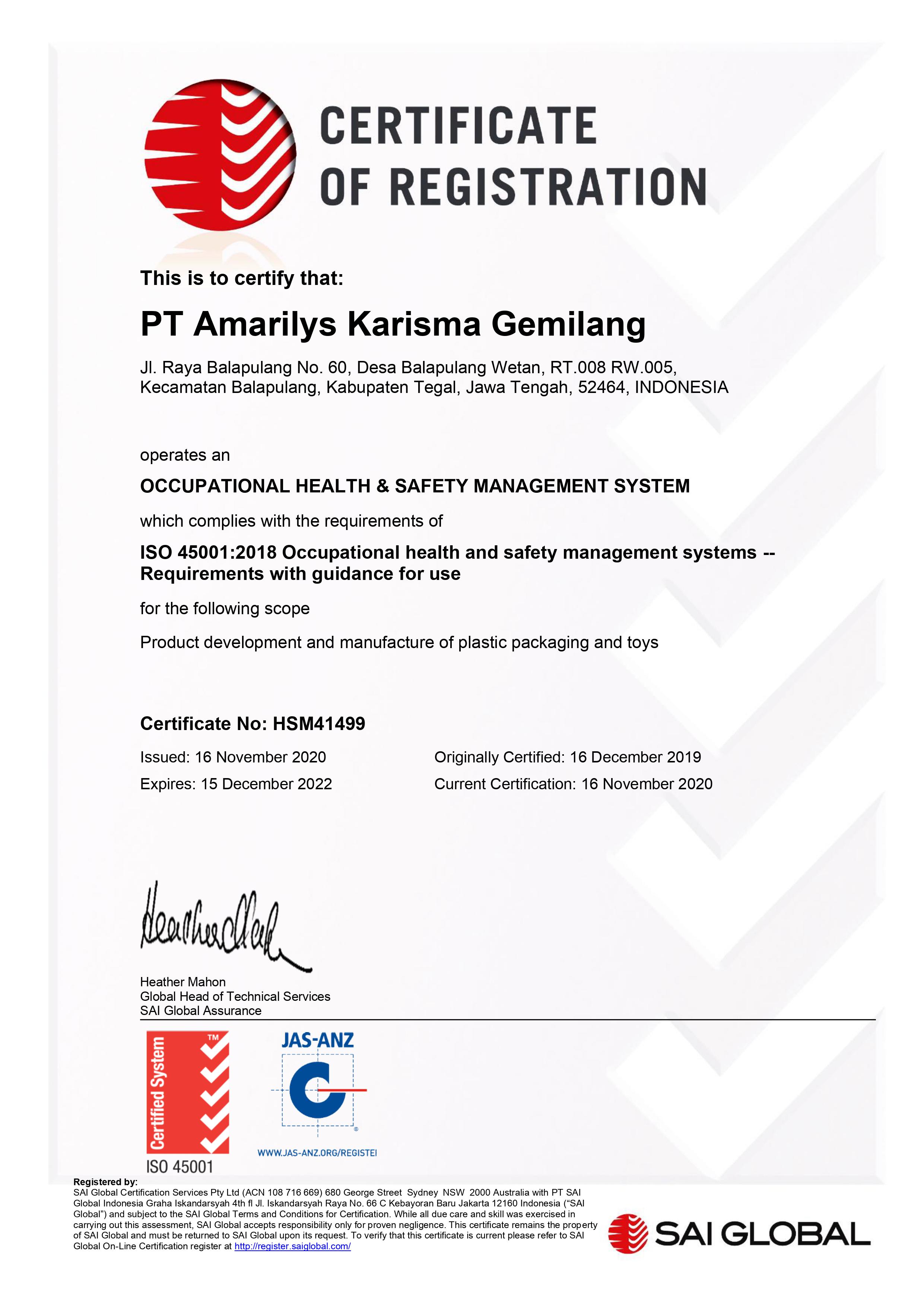 Type of Certificate Occupational Health & Safety Management System