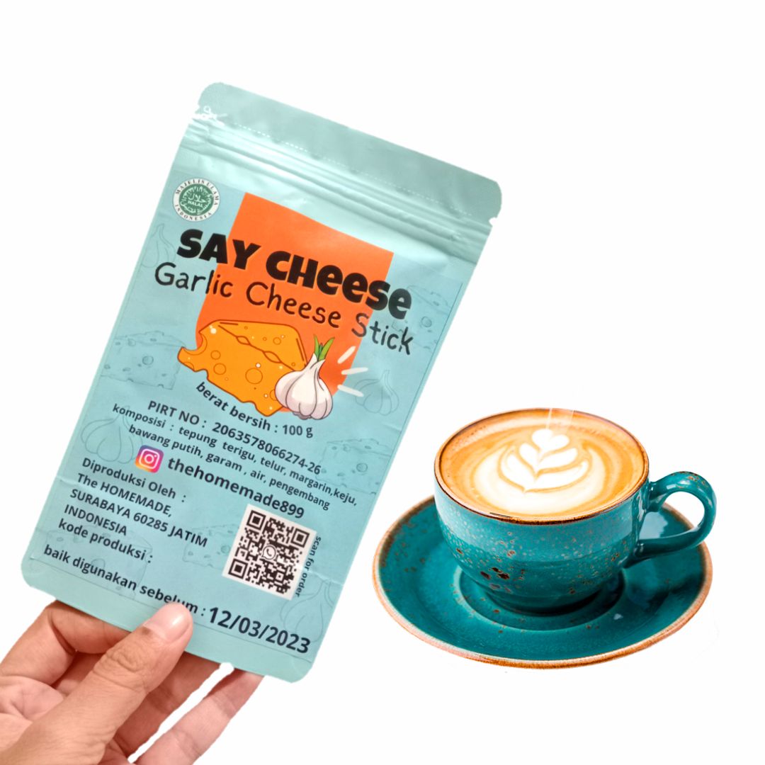 garlic cheese stick, snack with garlic and cheese flavour, halal, PORT, ingredient flour, eggs,margarine, garlic, salt. packaging 80g