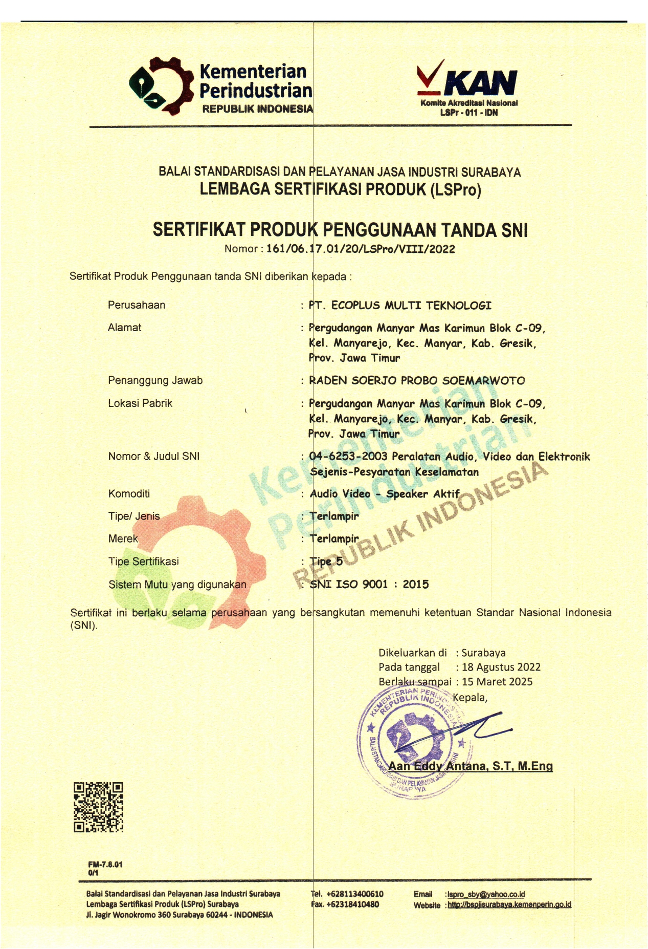 Type of Certificate SNI ISO 9001:2015