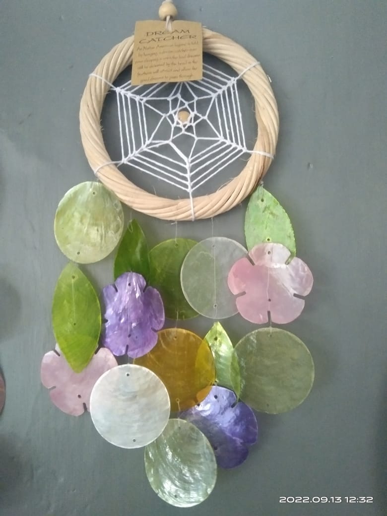 : shell crafts, bamboo bells, rattan and dream catchers