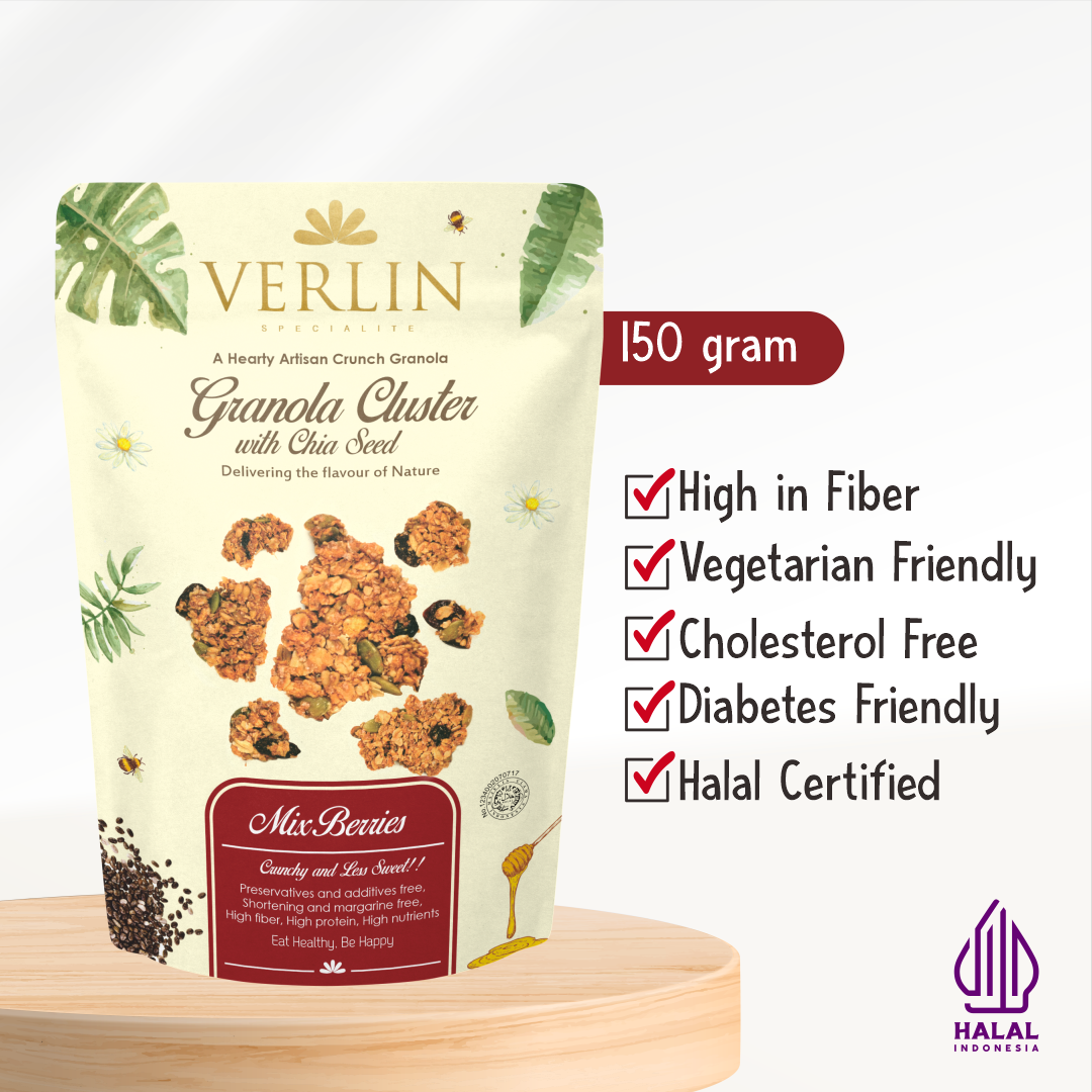Verlin Granola Cluster Mix Berries has the right size for one bite. It is very suitable for healthy snacks, tea companions, or as an alternative food on the sidelines of your busy life because it is practical, healthy and high in fiber. This product is made of oats, pumpkin seeds, chia seeds, flaxseeds, and a little ground cinnamon and combined ...