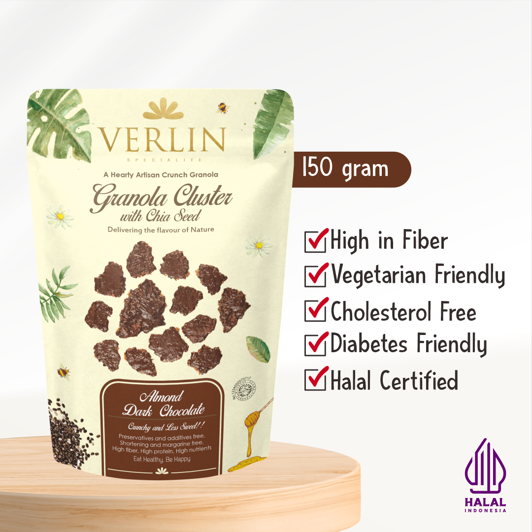 Verlin Granola Cluster Almond Dark Chocolate has the right size for one bite. It is very suitable for healthy snacks, tea companion, or as an alternative food on the sidelines of your busy life because it is practical, healthy and high in fiber. This product is made from roasted oats, almonds and chia seeds then coated with delicious dark...