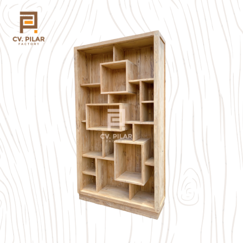 This is a modern and minimalist bookshelf made entirely of teak wood. Its design features a unique layout with various sized open shelves, giving it a distinctive and functional look. The natural color of the teak wood adds warmth and a touch of nature to any room.
