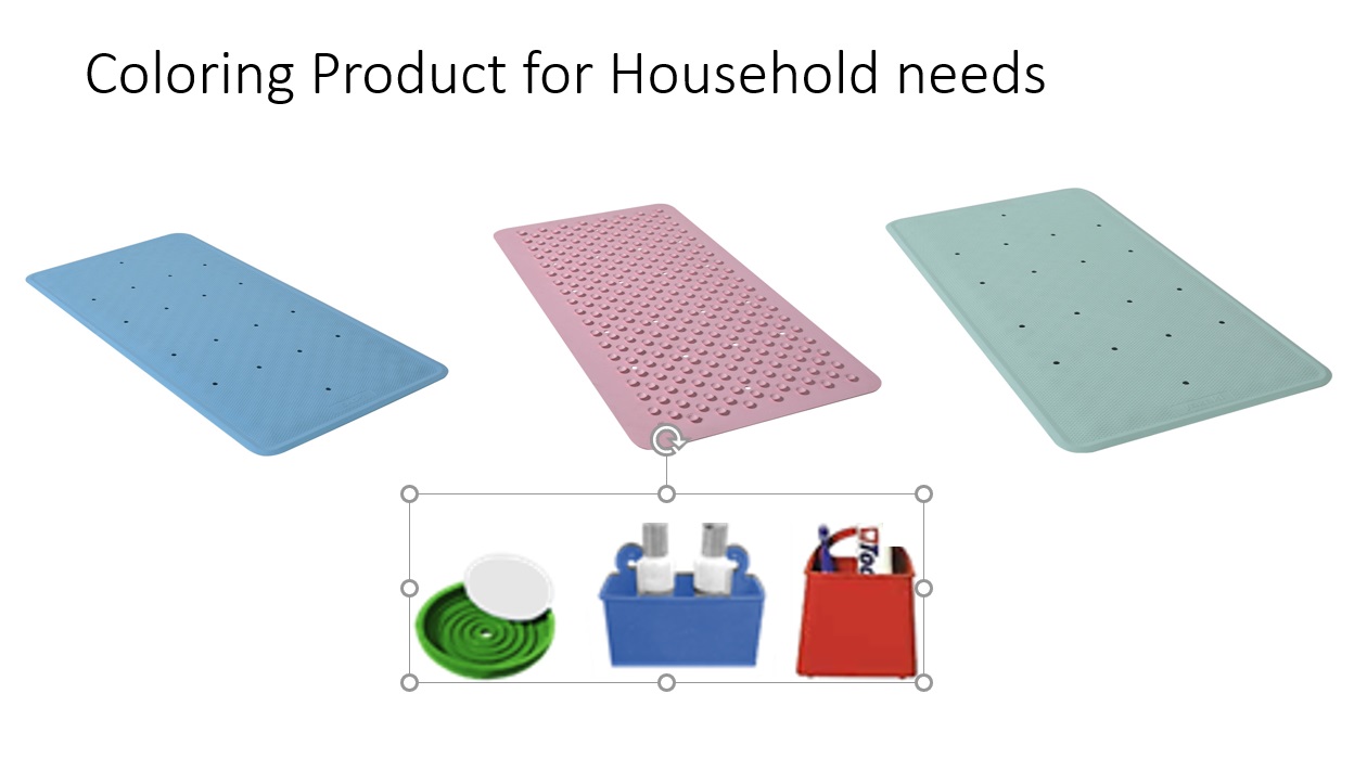 We also produce Colouring Rubber Product which is usually needed for household needs items such as Rubbber Bathmat, soap, brush and toothpaste, etc