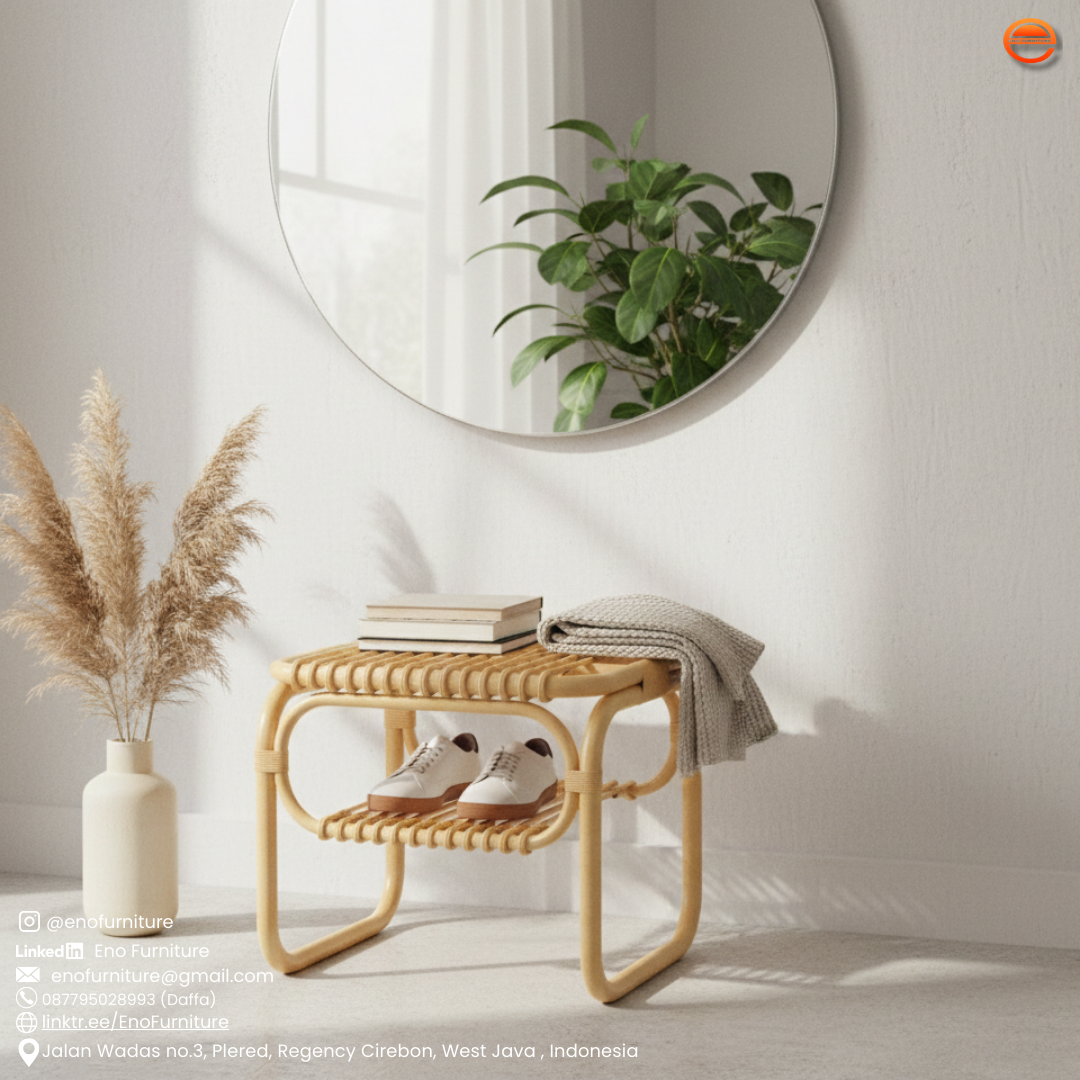 Modern Rattan Stool Bench - Minimalist Entryway Seat with Tiered Storage
