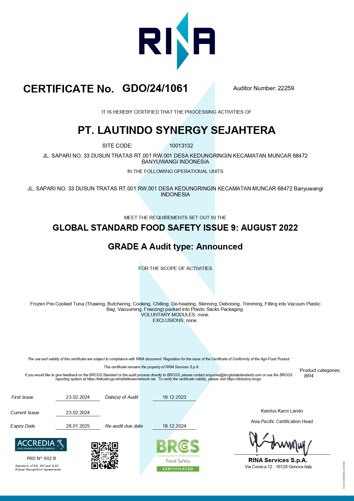 Located in Muncar, Banyuwangi, PT. LSS started fully operating in January 2021 as a producer of Frozen Precooked Tuna Loins, which is used as raw material for canned tuna. As of 2023, PT. LSS has reached production capacity of 55 MT raw material / day and employed a total of 800 workers, and in 2023 exported 161 FCL containers to various countries including Thailand, Ecuador, Japan, Jordan, Oman, Mexico, and others. As of Q1 of 2024, we have exported 76 FCL containers and have a goal of exporting 300 containers in 2024.