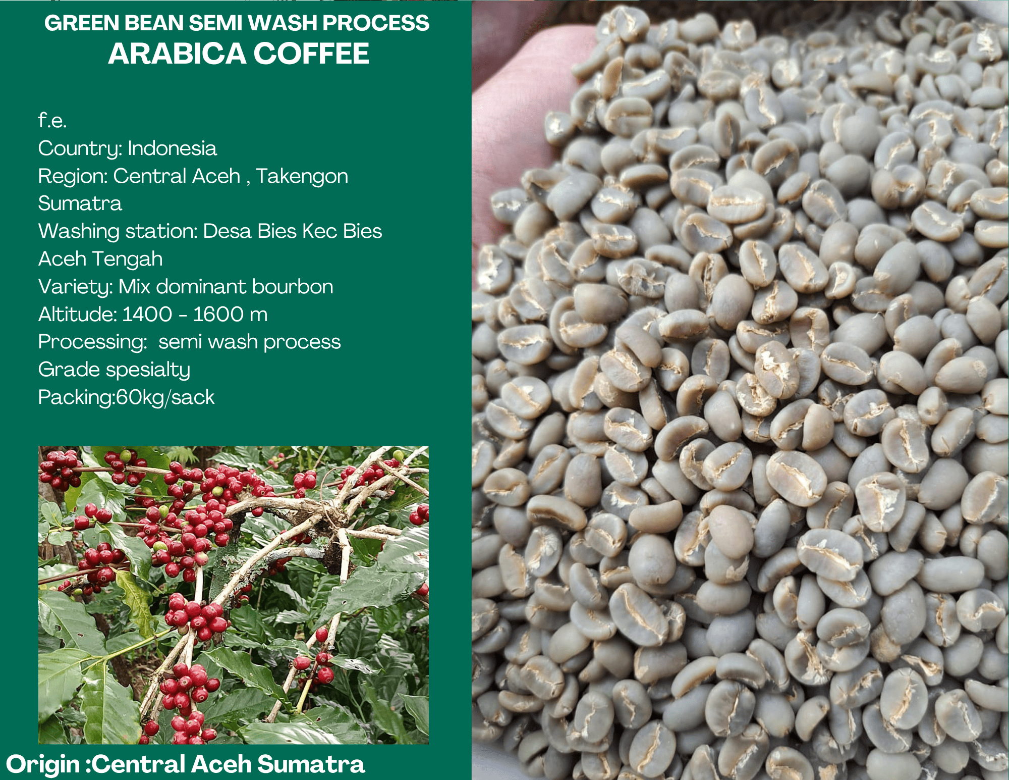 origin central aceh sumatra  Country: Indonesia Region: Central Aceh , Takengon Sumatra Washing station: Desa Bies Kec Bies Aceh Tengah Variety: Mix dominant bourbon Altitude: 1400 - 1600 m Processing: fullwash wash process Grade spesialty