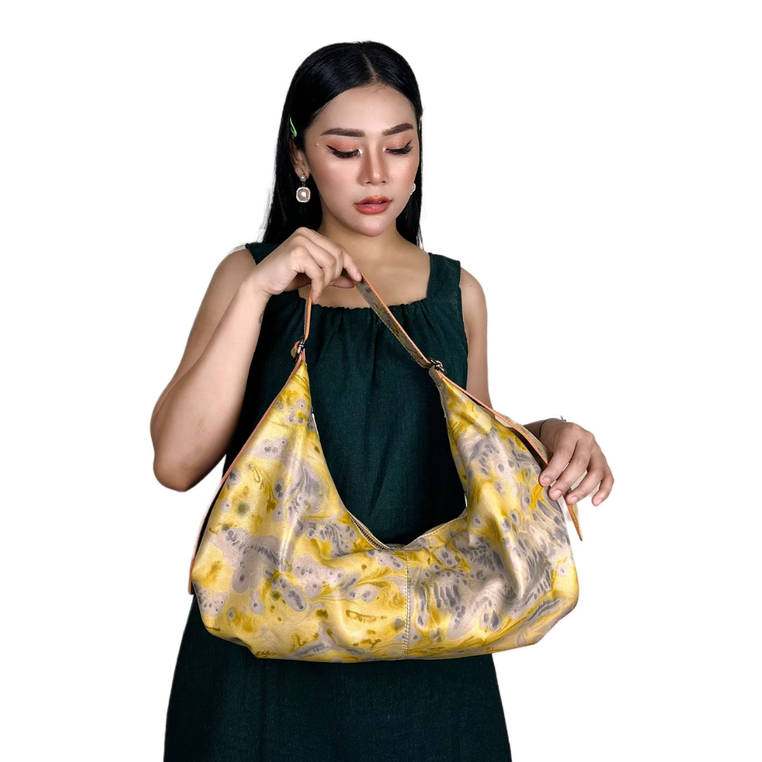 This product is constructed from high-quality, authentic bovine leather, incorporating a water colouring transfer technique. The bag's ...