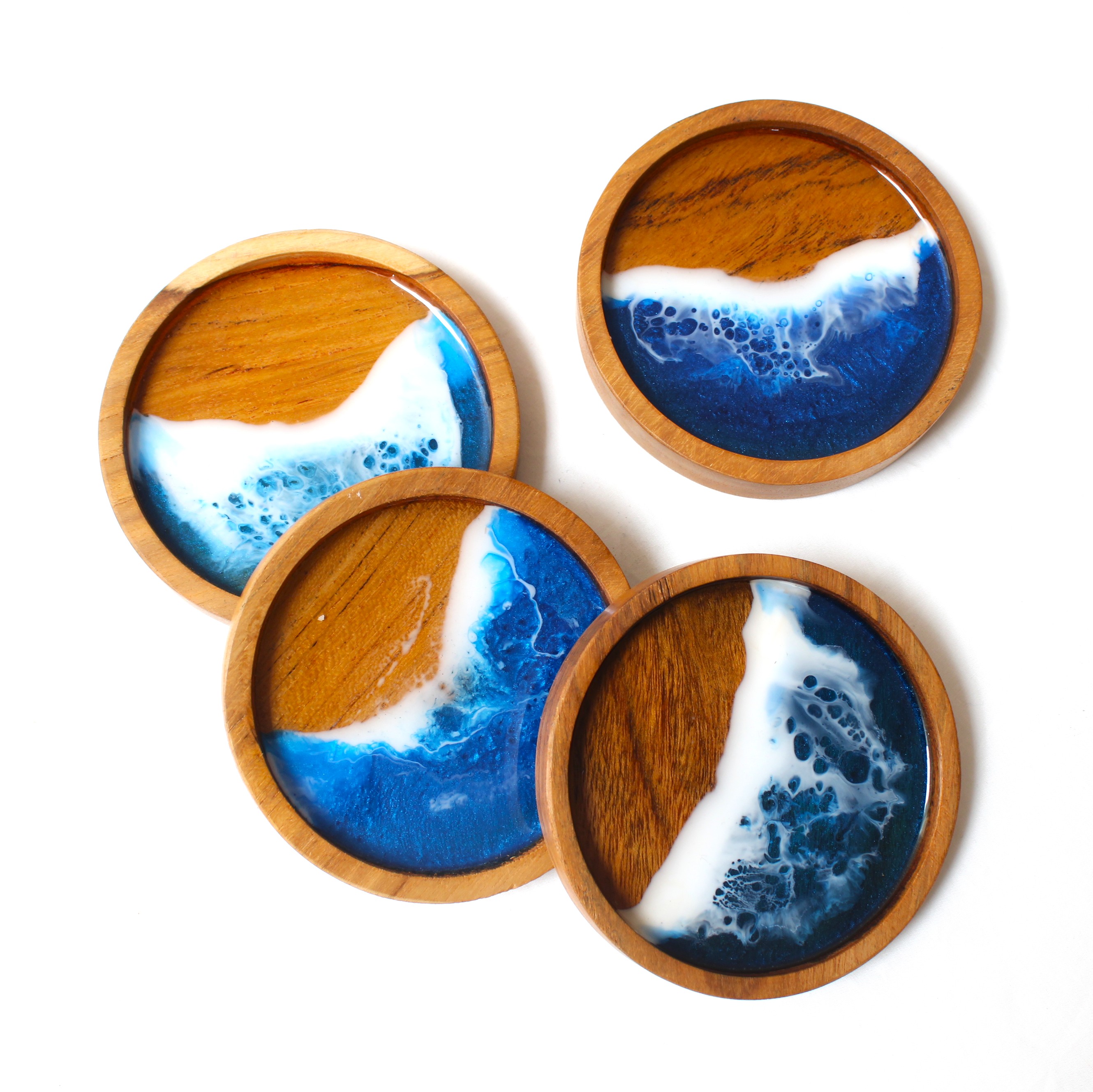 Beautifully handcrafted wooden coasters infused with resin art, available in nature-inspired floral or ocean wave designs. A perfect blend of functionality and artistic elegance for home or café ...