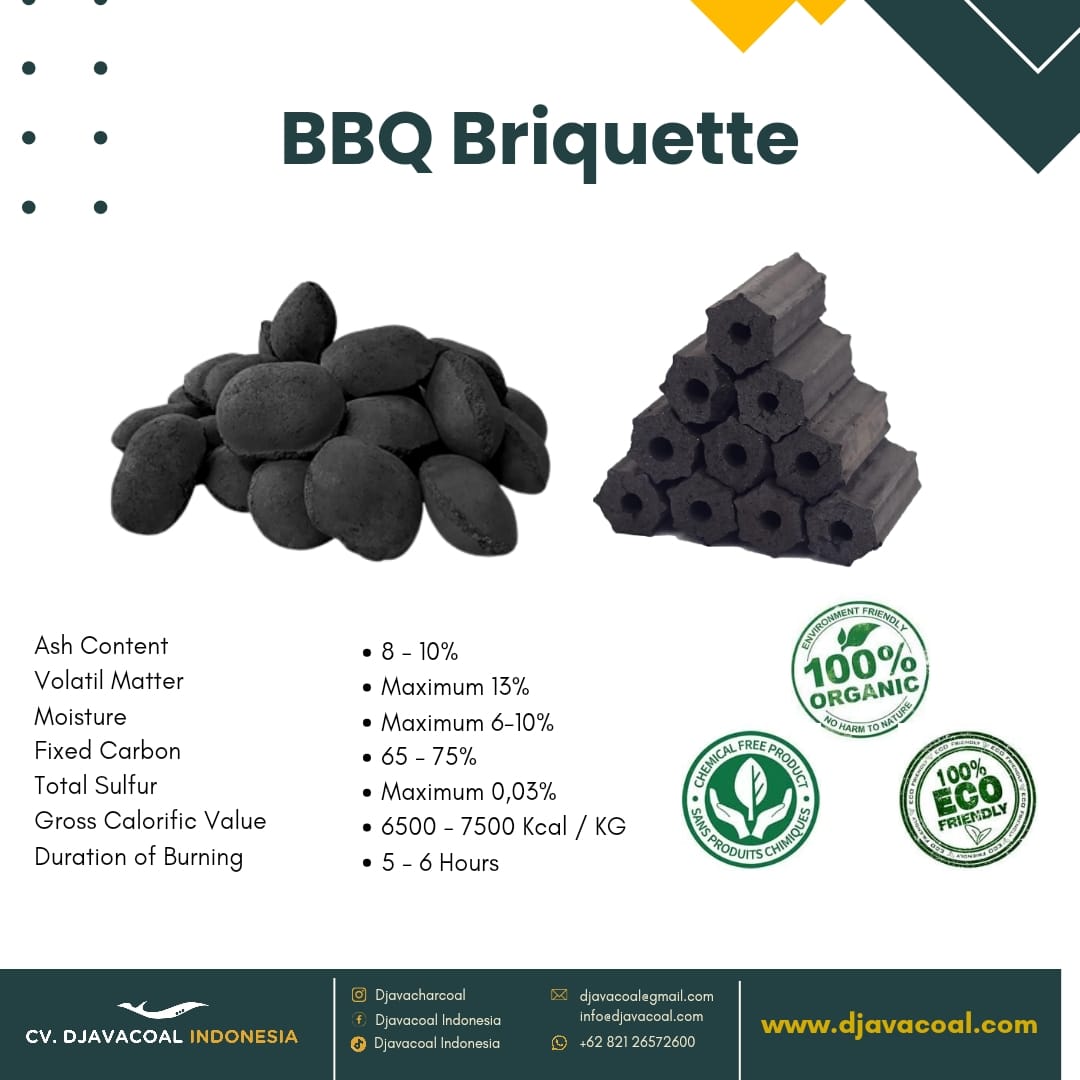 CV. Djavacoal Indonesia is a supplier and exporter of premium Coconut Charcoal Briquette , BBQ Charcoal Briquette and Sawdust Charcoal briquette. We are committed to being an innovative company and actively operating in the international briquette industry serving the needs of partners and building the Indonesian economy. Apart from producing cocounut briquettes for hookah / shisha, we also provide hardwood charcoal for barbeque, Hardwoods from mahony and halaban and a variety of other hardwoods that are widely needed for export to various countries Indonesia is the best coconut charcoal in the world. Therefore we believe that we can ensure that our products are processed with the best raw material. we are the supplier which have 3 factories that work together closely with us in Java Island, Indoneisa