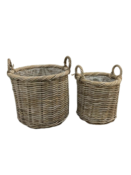 rattan material using half kubu jawit grey set 2. Size : Big 45 x H.39, Small 36 x H.33. Handle 8 cm. Accessories plastic inside. No finishing, No Topcoat. Please chat our marketing for further information and update price : whatsApp +6282218765081