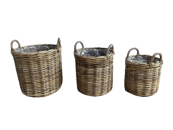 rattan material using Half Kubu Jawit grey set 3. Size Big 44 x H.42, Medium 37 x H.38, Small 30 x H.31. Handle 8 cm. Accessories plastic inside. No Finishing, No packing (only rope) Please chat our marketing for further information and update price : whatsApp +6282218765081