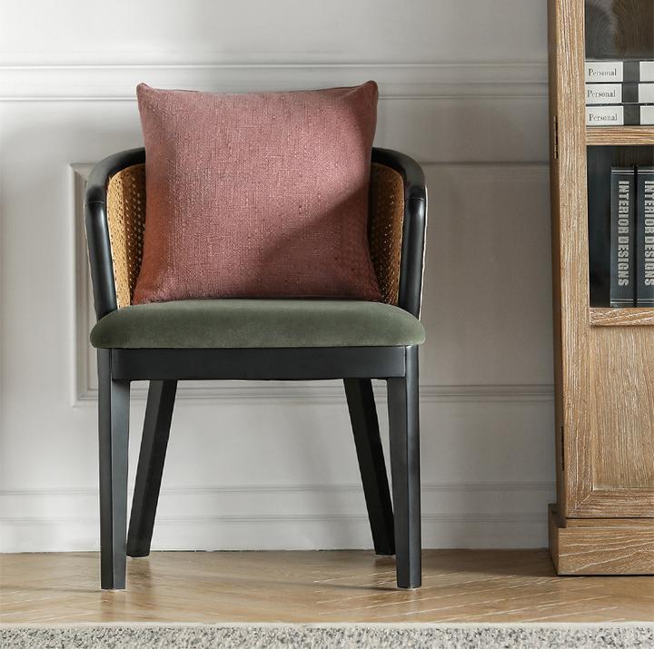 Combination materials refresh retro dining style, backrest with woven rattan for the perfect contrast. High-performance linen mix seating in neutral hues for a...