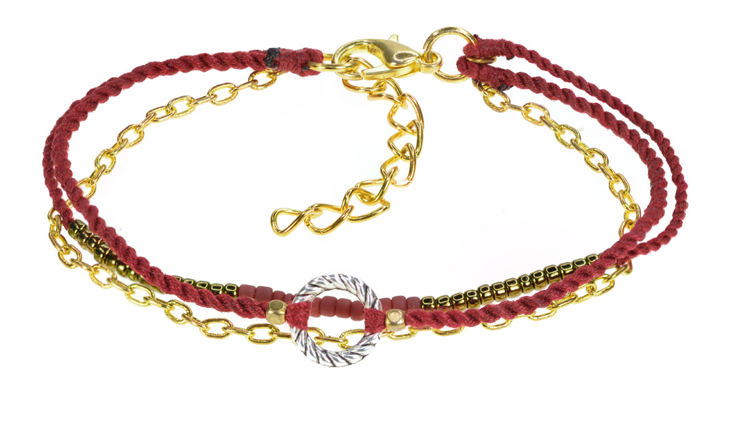 Bracelet with Gold Color Chain, Japanese Glass Seedbeads, Silver Color Ring and Brass Color Beads on Two Lines of Handtwisted Cotton String