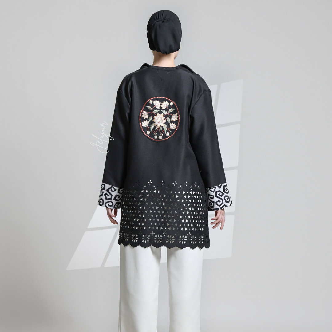 Ethnic clothing in the form of a batik outer combination with embroidery and laser cut details.