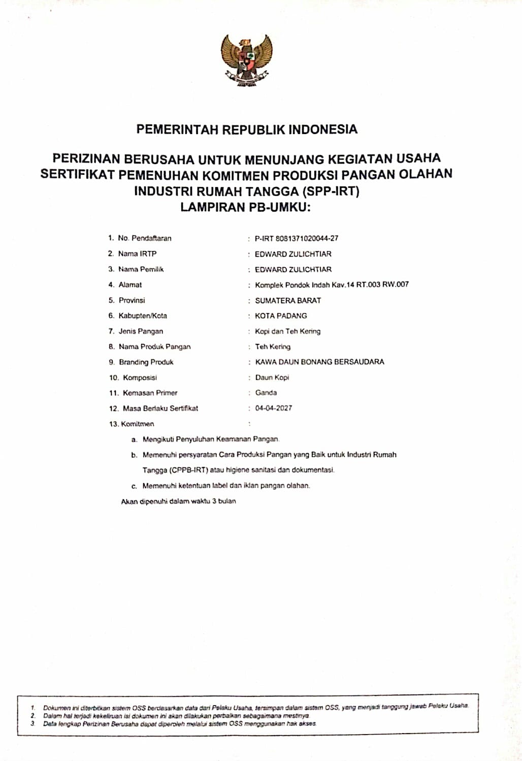 Type of Certificate Minuman