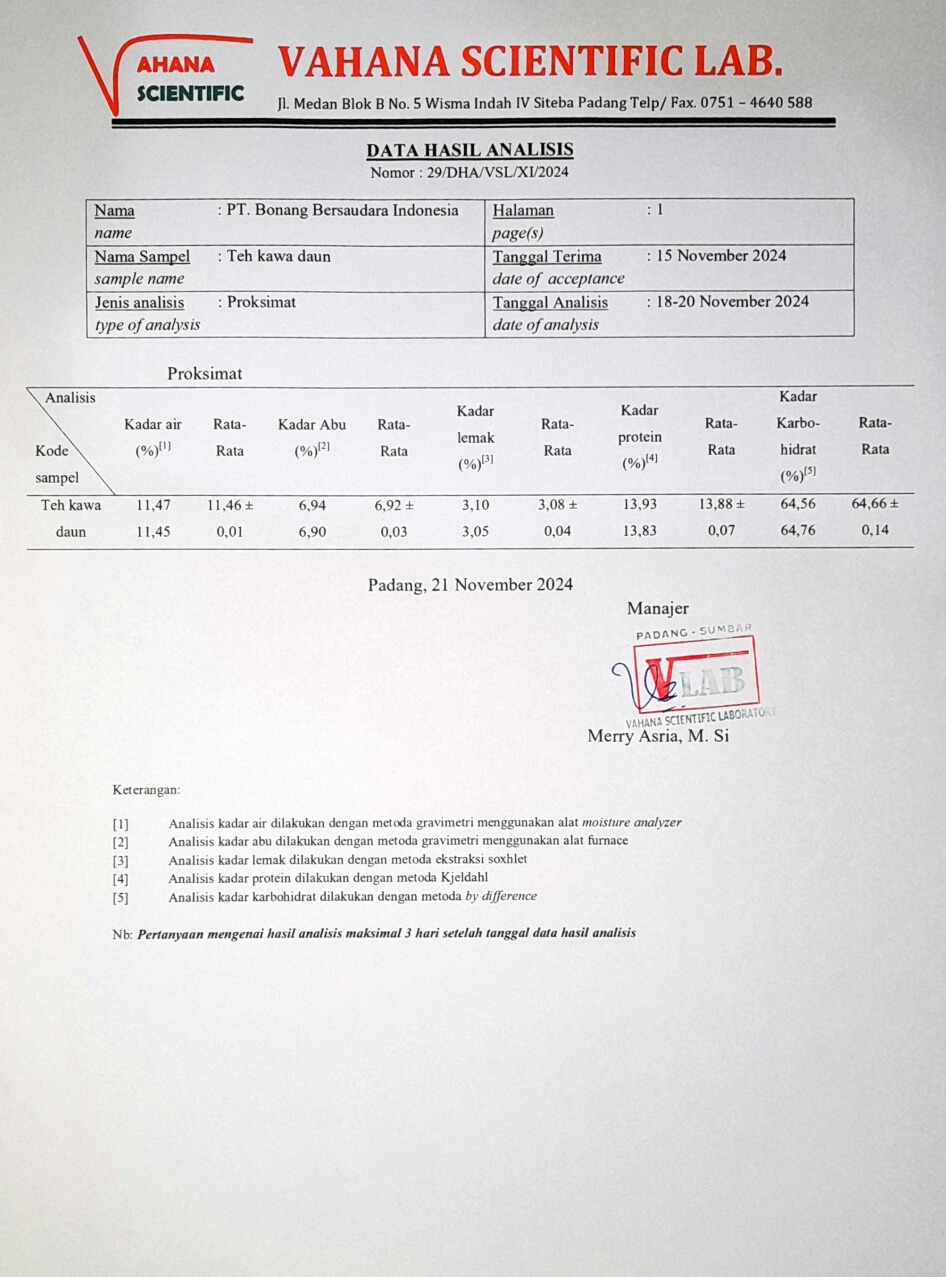 Kami produsen minuman tradisional khas Sumatera Barat dari jaman penjajahan yaitu Kawa daun yang berbahan baku hanya dari daun kopi Robusta pilihan di petik dari pohon kopi yang sudah berusia 1 abad. Daun kopi ini setelah di petik dan di bersihkan kemudian di asap atau di sangari sampai berwarna kecoklatan. Setelah daun kopi berwarna coklat kemudian siap di seduh dengan air panas atau di rebus. Air Kawa daun ketika akan di minum aroma harum dan nikmat waktu meminumnya.